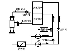 此方案不涉及低區(qū)系統(tǒng),只是解決了高區(qū)壓頭利用問題。無論如何,回水壓頭的利用就是行之有效的節(jié)電措施。因?yàn)樗苊饬斯?jié)流降壓過程中產(chǎn)生的摩擦損失。