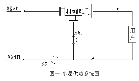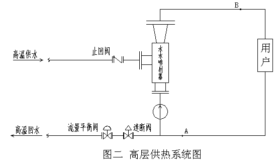 2 、如果用戶散熱器承受不了如此高壓,那么噴射器的設(shè)計(jì)出口壓力(供水壓力)必須降低,回水壓力也會(huì)降低,要達(dá)到規(guī)定的高溫水回水流量,水泵必須增加揚(yáng)程。不過由于噴射器的引射能力加大使水泵二的功率節(jié)省一部分,此時(shí)系統(tǒng)在 A 處裝止回閥, B 處裝速斷閥,以防止二次網(wǎng)超壓。